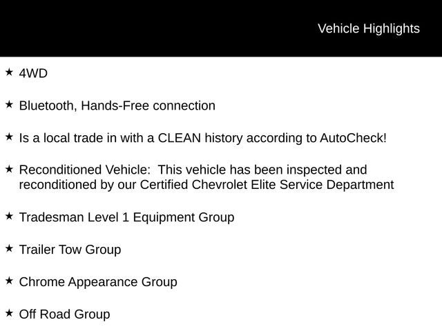 - Reconditioned Vehicle: This vehicle has been inspected and reconditioned by our Certified Chevrolet Elite Service Department