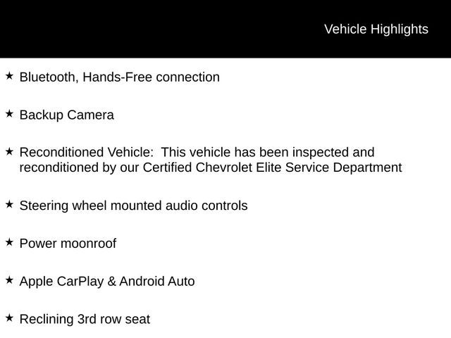 - Reconditioned Vehicle: This vehicle has been inspected and reconditioned by our Certified Chevrolet Elite Service Department