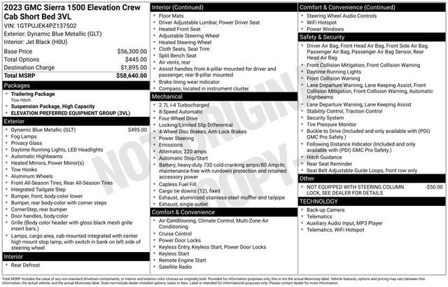 The Sierra 1500 Elevation's stunning Dynamic Blue Metallic exterior exudes confidence, while the interior offers a premium, well-appointed cabin that prioritizes your comfort and convenience. Equipped with a robust 2.7L I4 Turbocharged engine, this Sierra delivers an impressive 310 horsepower and up to 20 mpg on the highway, making it a versatile choice for both work and play.