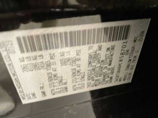 **We Deliver from our floor to your door! It's that easy! If you live within one hundred miles of our dealership, we will also deliver your car. See Dealer for delivery details. Buy Online-Get Trade Value Online-Email-Chat-Phone-Text and we will Deliver your Pre-owned vehicle to your door.** 18 Aluminum Alloy Wheels, 4-Wheel Disc Brakes, 5.604 Axle Ratio, 6 Speakers, ABS brakes, Air Conditioning, Alloy wheels, AM/FM Radio, AM/FM radio: SiriusXM, Auto High-beam Headlights, Automatic temperature control, Black Splash Guards (Set of 4), Brake assist, Bumpers: body-color, Chrome Rear Bumper Protector, Cloth Seat Trim, Delay-off headlights, Driver door bin, Driver vanity mirror, Dual front impact airbags, Dual front side impact airbags, Electronic Stability Control, Emergency communication system: NissanConnect Services, Floor Mats w/1-Piece Cargo Area Protector, Four wheel independent suspension, Front anti-roll bar, Front Bucket Seats, Front Center Armrest, Front dual zone A/C, Front reading lights, Fully automatic headlights, Heated door mirrors, Illuminated entry, Knee airbag, Low tire pressure warning, NissanConnect featuring Apple CarPlay and Android Auto, Occupant sensing airbag, Outside temperature display, Overhead airbag, Overhead console, Panic alarm, Passenger door bin, Passenger vanity mirror, Power door mirrors, Power driver seat, Power steering, Power windows, Radio data system, Rear anti-roll bar, Rear Parking Sensors, Rear seat center armrest, Rear side impact airbag, Rear window defroster, Rear window wiper, Remote keyless entry, Speed control, Speed-Sensitive Wipers, Split folding rear seat, Spoiler, Steering wheel mounted audio controls, Tachometer, Telescoping steering wheel, Tilt steering wheel, Traction control, Trip computer, and Variably intermittent wipers.