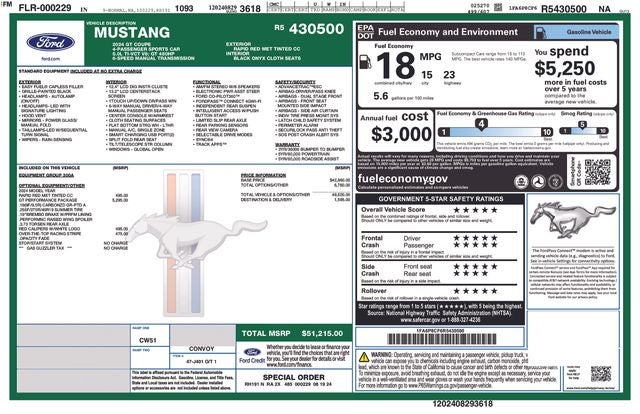 Inside, you'll find a host of premium features, including Bluetooth®, a Backup Camera, and the SYNC 4.0 infotainment system. The leather-wrapped steering wheel and shift knob provide a premium feel, while the sport-tuned suspension and performance tires deliver an exhilarating driving experience.